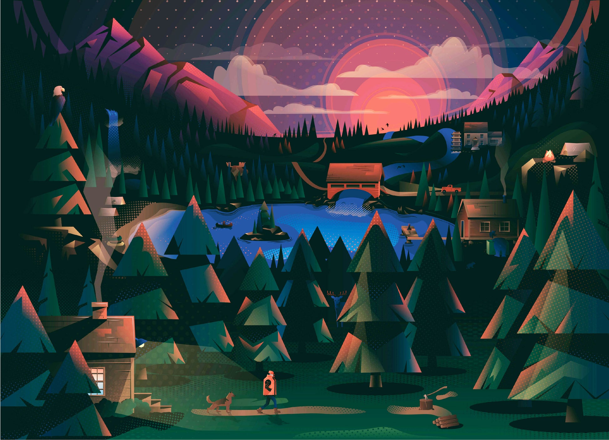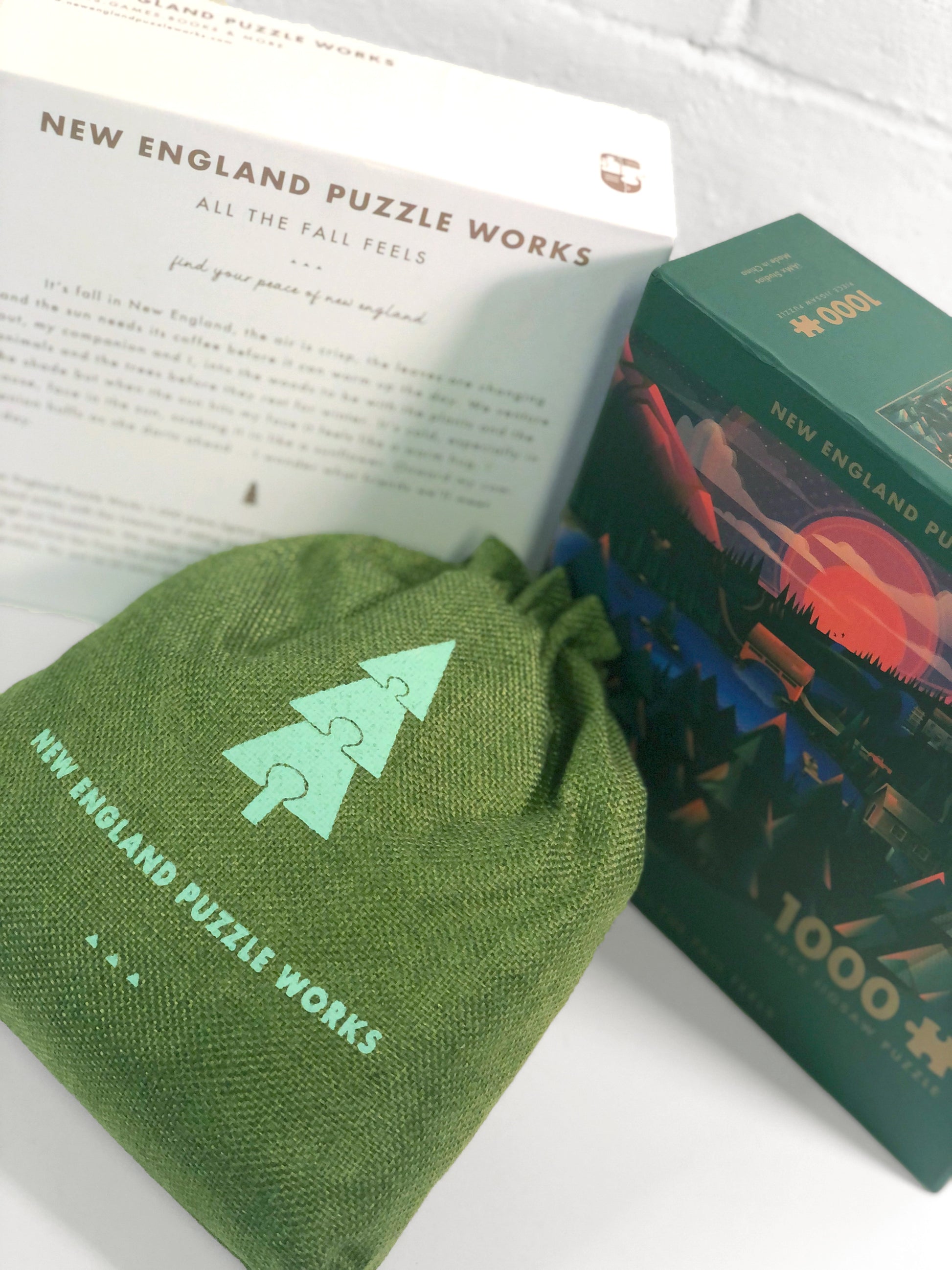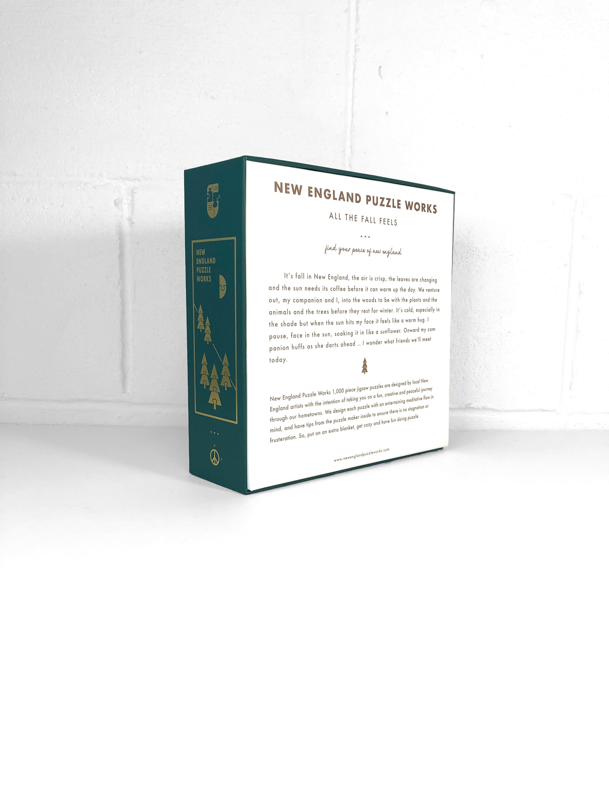 New England Puzzle Works - All The Fall Feels 1000 piece jigsaw puzzle (27"w x 20"h) with custom die cut pieces, made from recycled chipboard. Take a stroll through the woods of New England on a crisp Fall morning and see how many friends you meet with this custom designed, nature inspired puzzle.