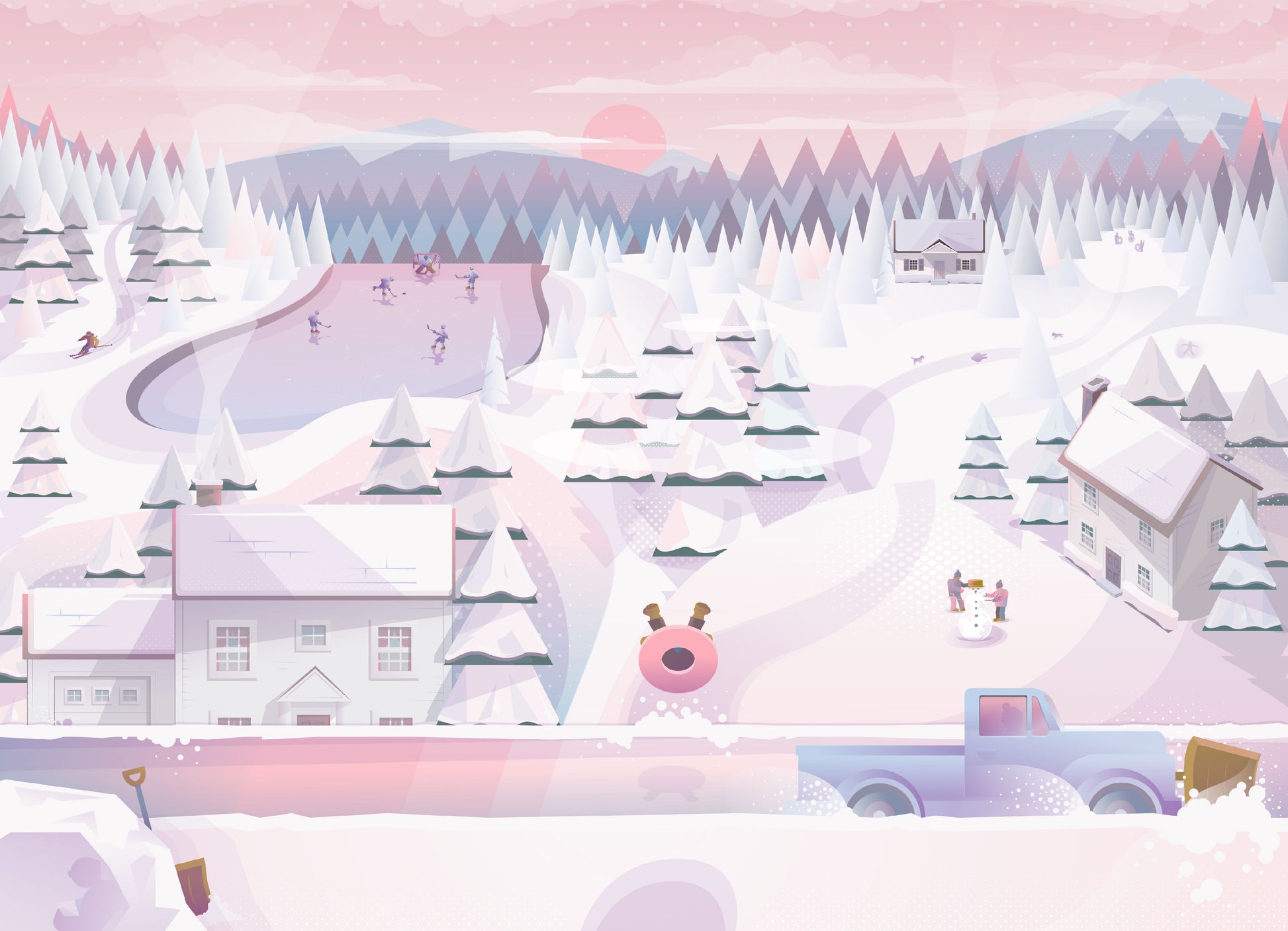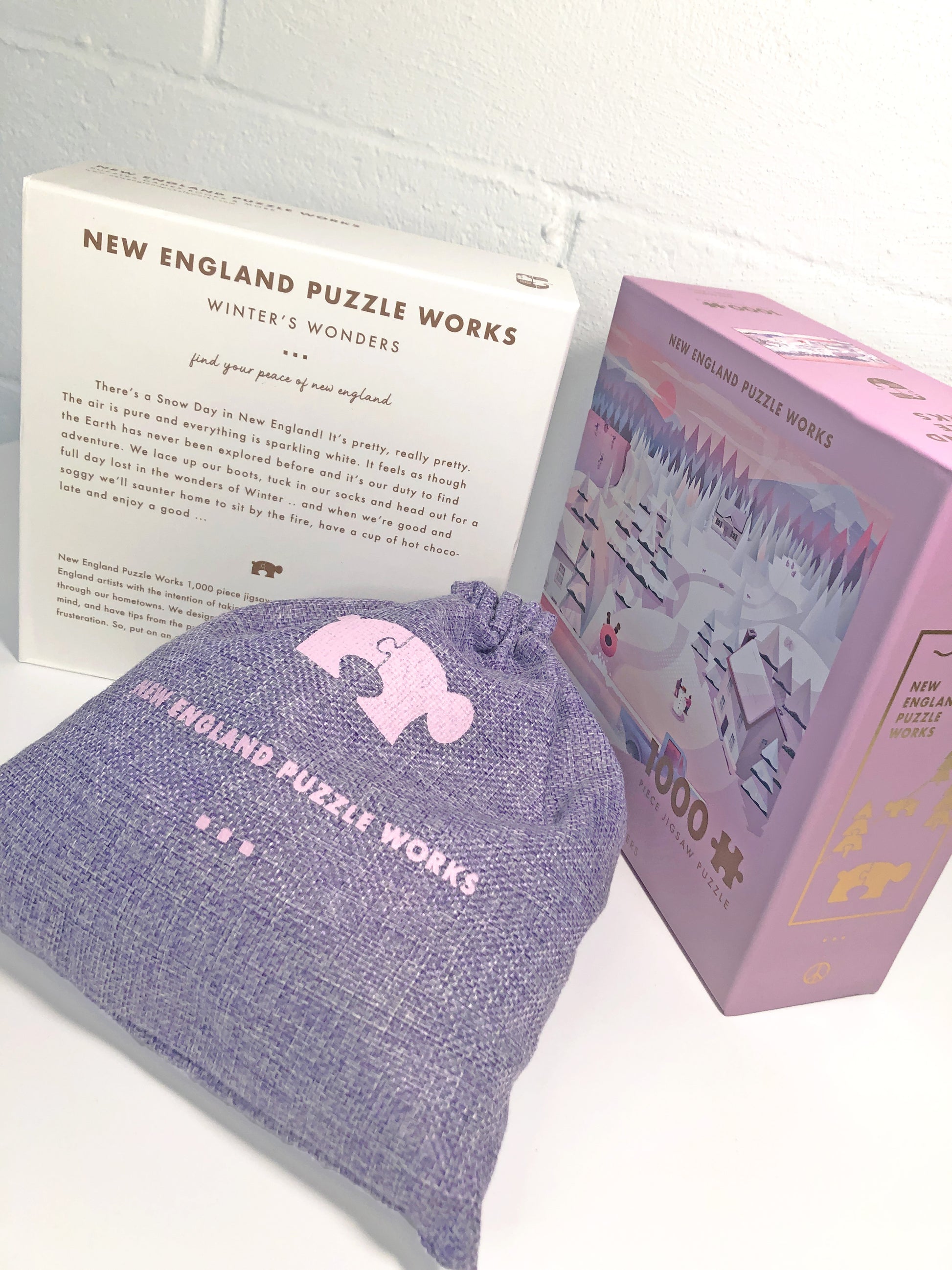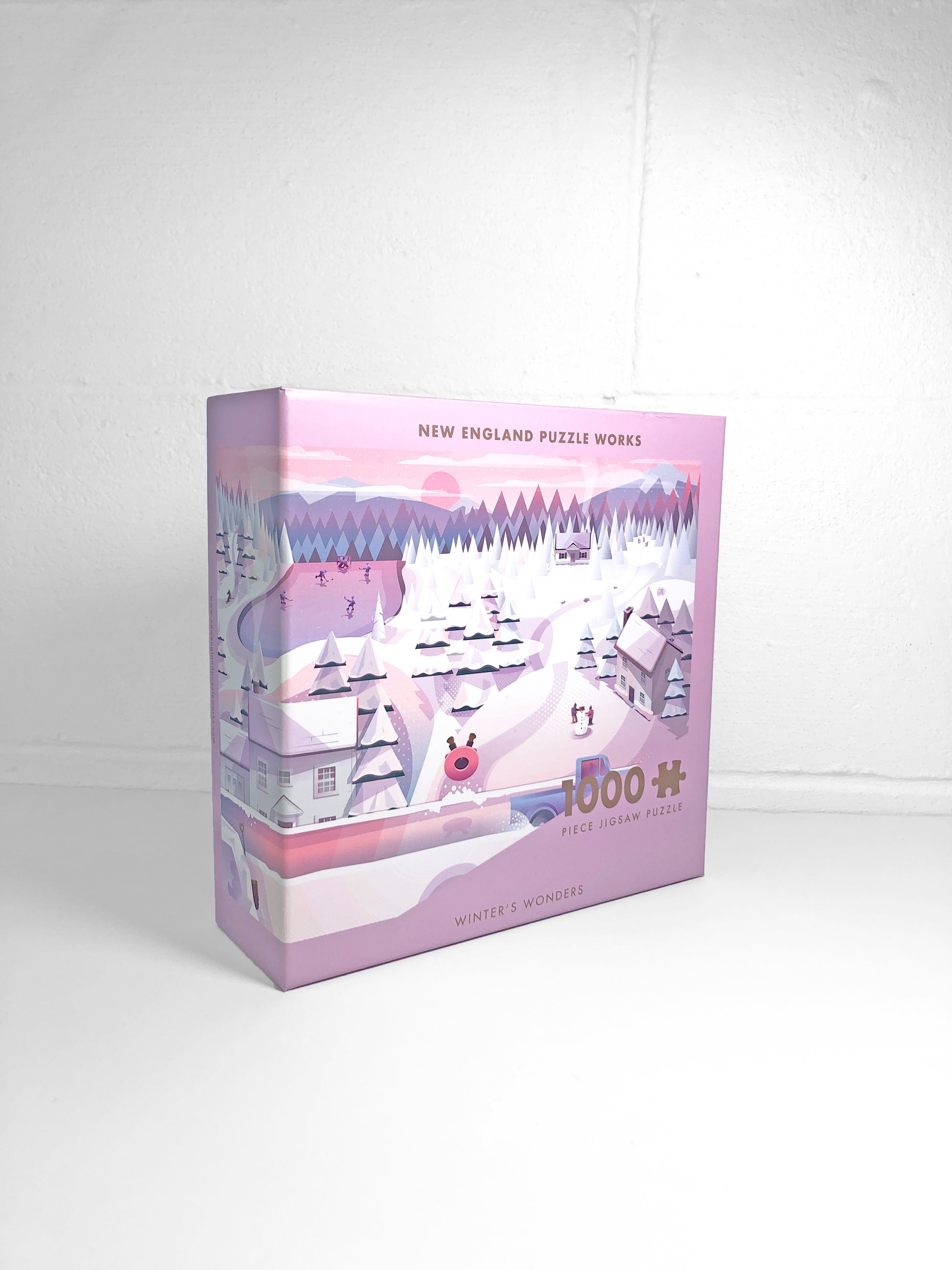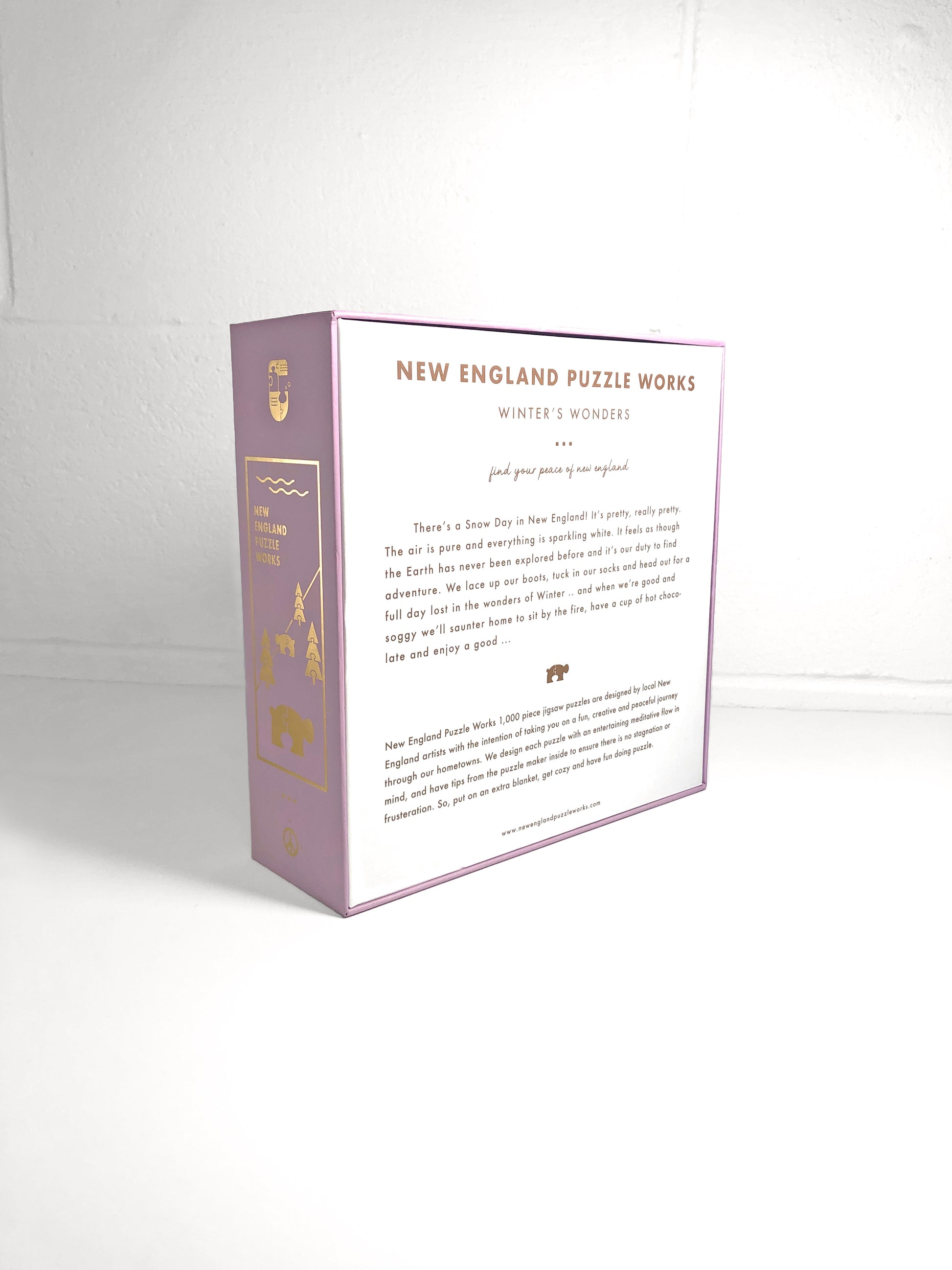 New England Puzzle Works - Winter's Wonders 1000 piece jigsaw puzzle (27"w x 20"h) with custom die cut pieces, made from recycled chipboard. It's a snow day in New England! Get outside and find adventure in the wonders of Winter with this custom designed, nature inspired puzzle.